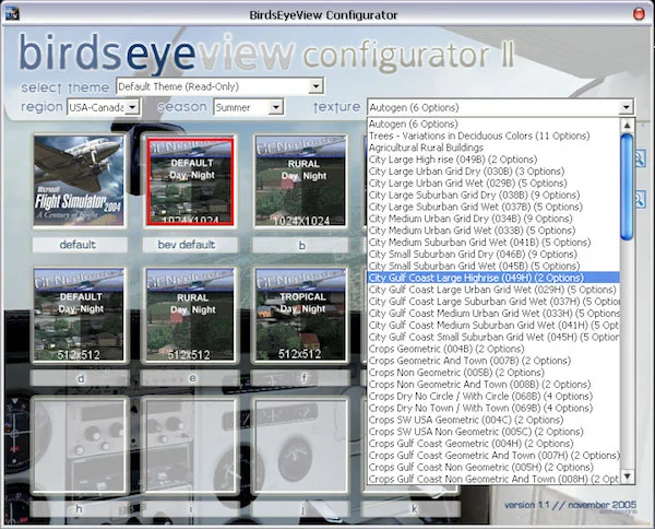 The BirdsEyeView Configurator v2.o application provided an easy-to-use interface for customizing the thousands of possible combinations of photo-realistic scenery. The original Configurator application, developed by a previous developer, leveraged the (then) new .NET Platform, which caused some undue controversy within the BEV community. Version 2.0 was a ground-up rewrite based on the native Win32 API.